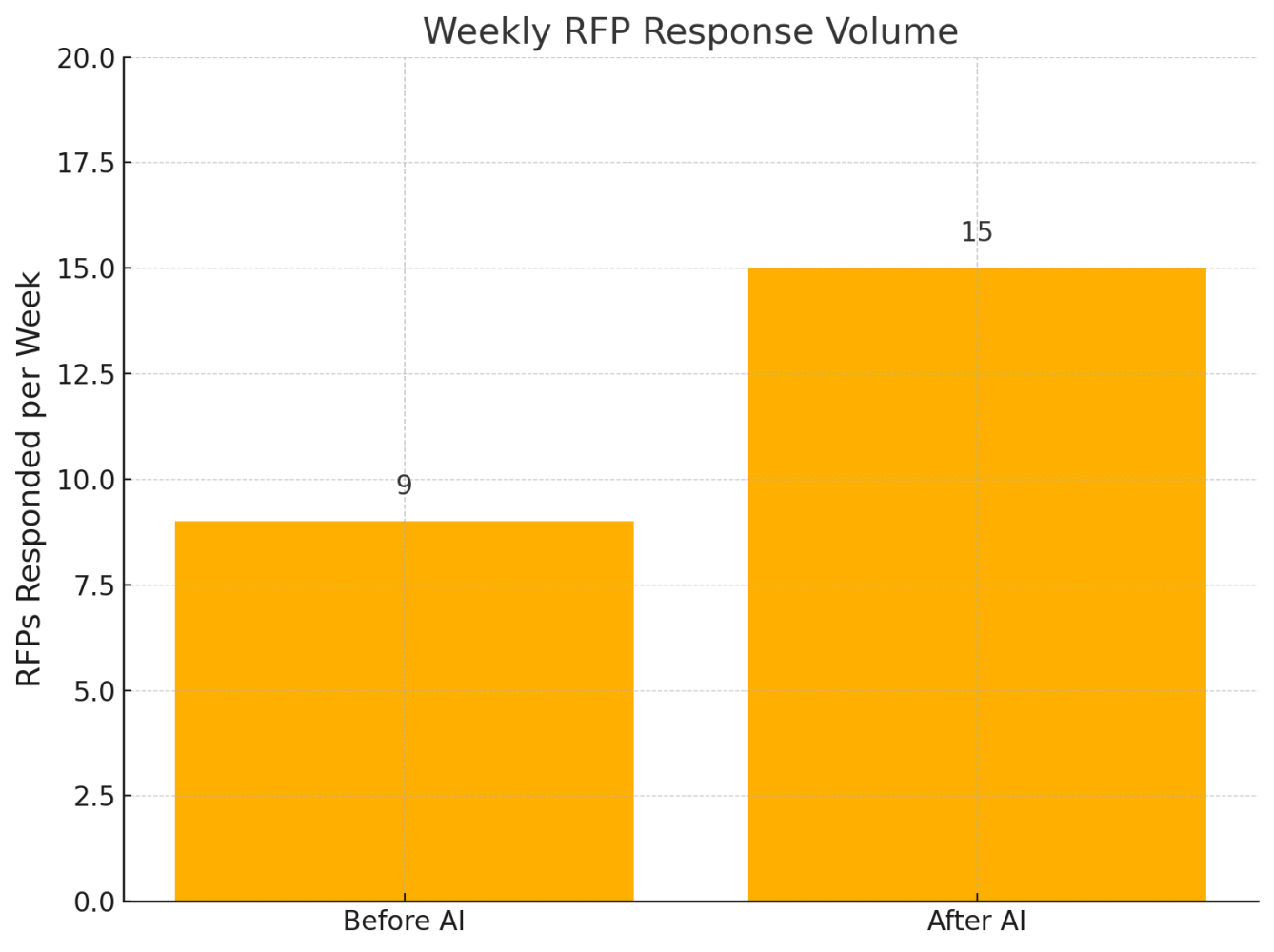 Comparison of how many RFPs the team can respond to per week, before vs. after AI implementation. With AI handling drafting and research, the team’s weekly RFP output is projected to rise significantly (e.g. from 9 to 15 in this illustration), in line with reported gains from AI-enabled proposal teams.