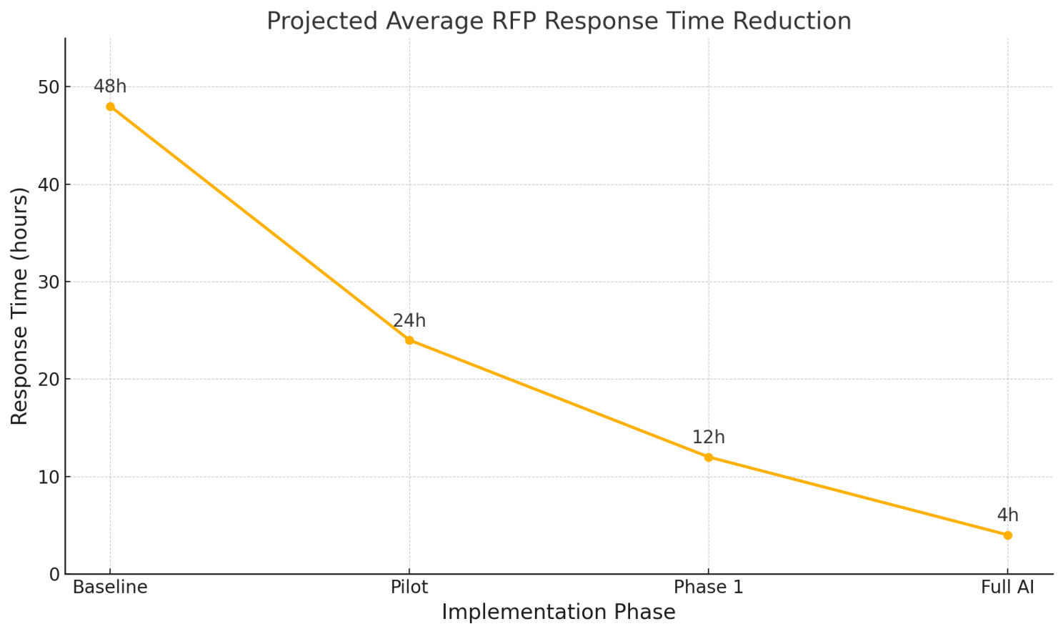 Comparison of how many RFPs the team can respond to per week, before vs. after AI implementation. With AI handling drafting and research, the team’s weekly RFP output is projected to rise significantly (e.g. from 9 to 15 in this illustration), in line with reported gains from AI-enabled proposal teams.